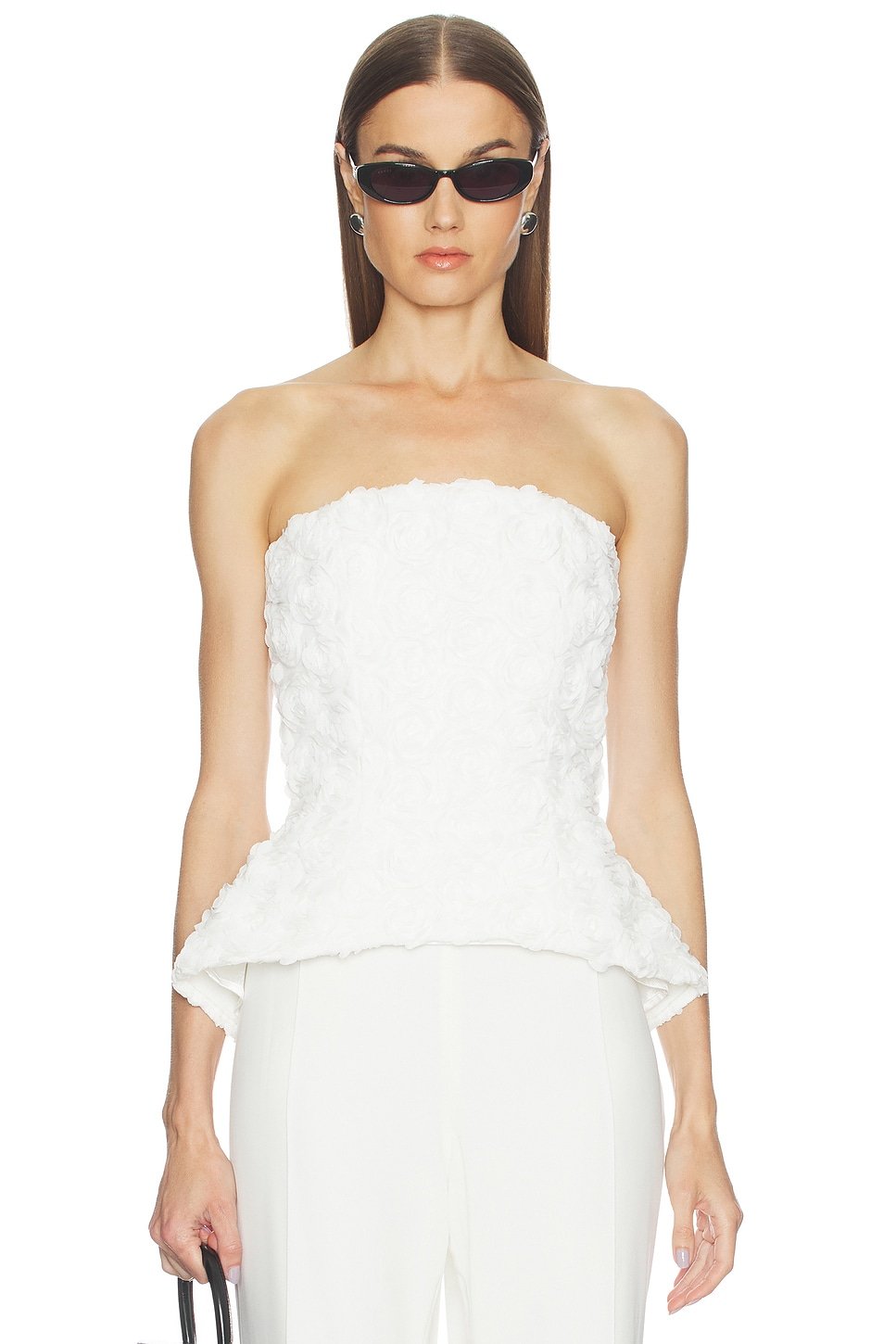 The Nadine Merabi White Peplum Top features a bandeau neckline and adjustable straps. Perfect for a casual day out or a smart-casual night in, this top adds a touch of elegance.