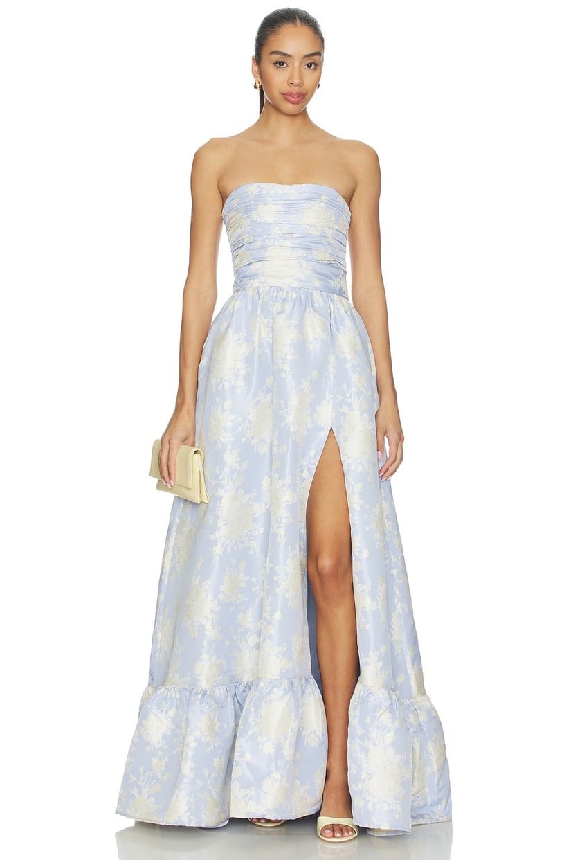 The Revolve Bonnet Blue Windsor Regina Gown is made from silk, polyester.