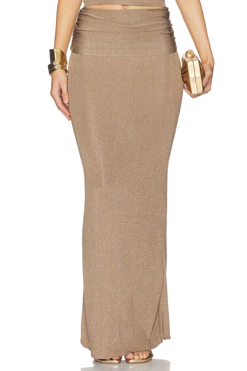 The Revolve Ruched Waist Maxi Skirt in Metallic Bronze is available in sizes XXXL, XXL, XL, XS, L, M, S.