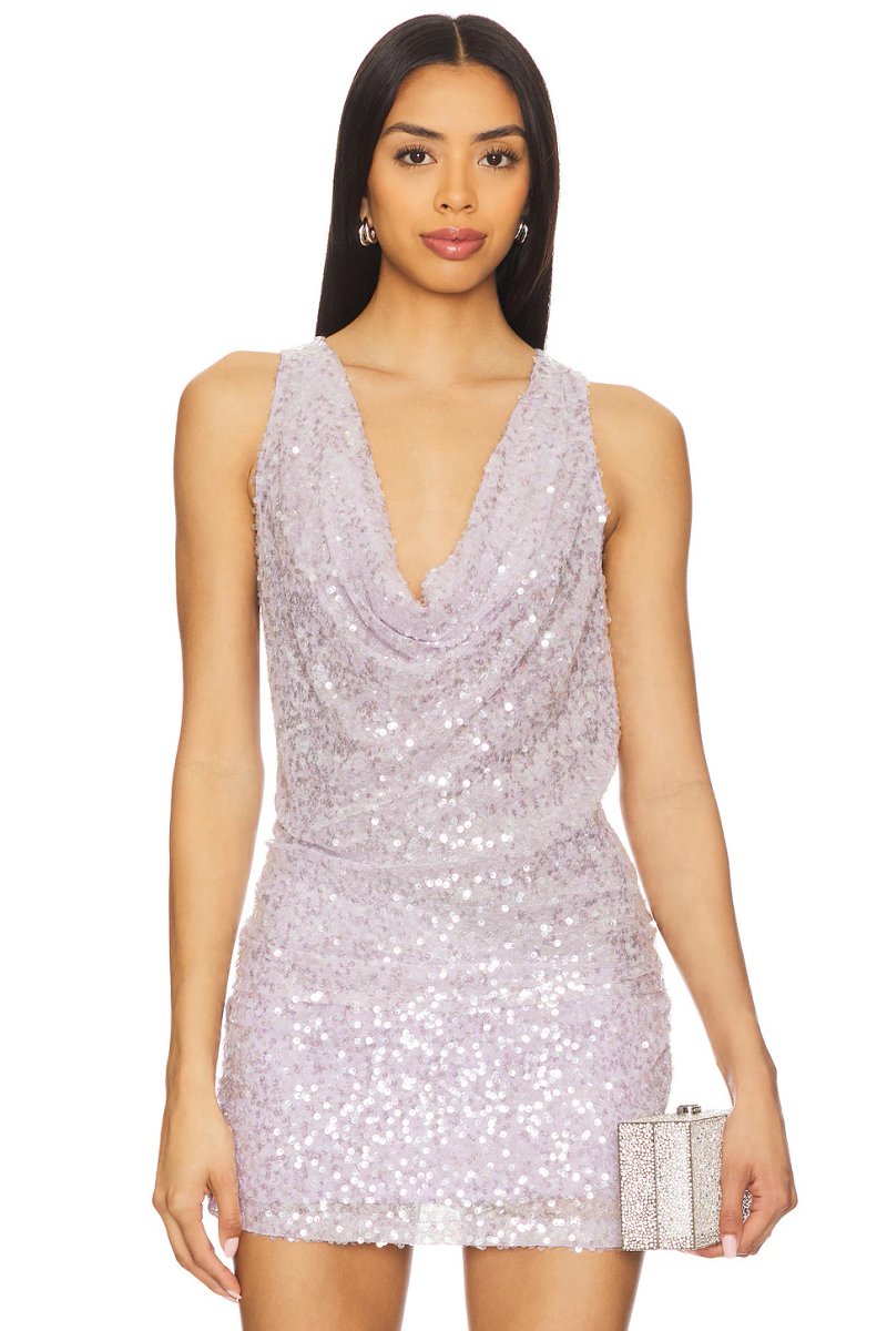 The Revolve Sequin Lilac V-Neck Mini Dress is available in sizes XXXL, XXL, XL, XS, L, M, S.