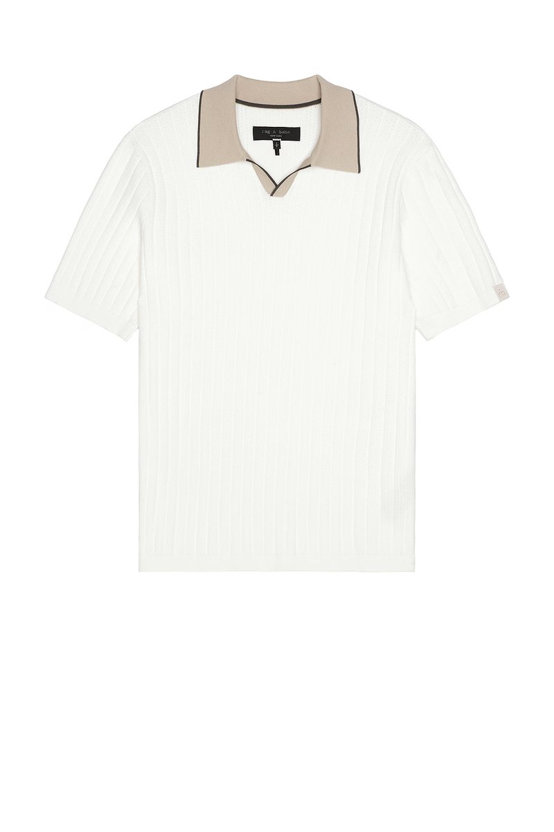 White Polo Shirt — the ultimate versatile shirt for smart-casual and business occasions. Designed with white, taupe collar, short sleeve, button closure, ribbed texture. Features a modern, professional look perfect for the office or smart social gatherings.