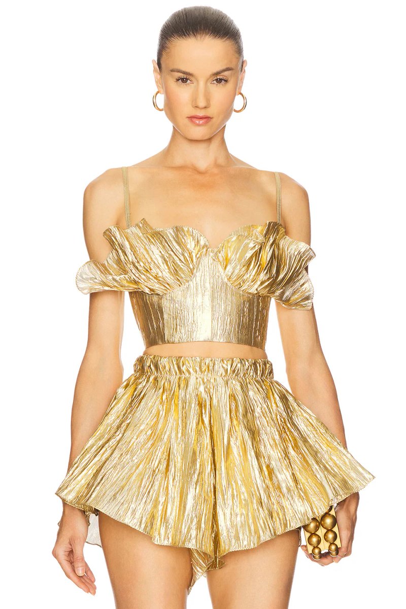 Designed with a gold metallic finish, off-shoulder neckline, and short sleeves, this Shelby Corset Top is perfect for a glamorous evening out.
