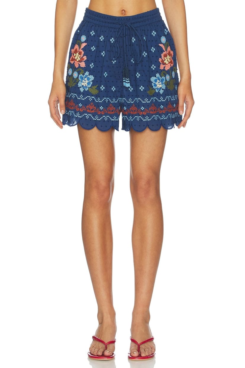 These FARM Rio shorts feature a dark blue base with intricate floral embroidery in red, blue, and white. The embroidered details add a bohemian touch, perfect for a casual summer look.