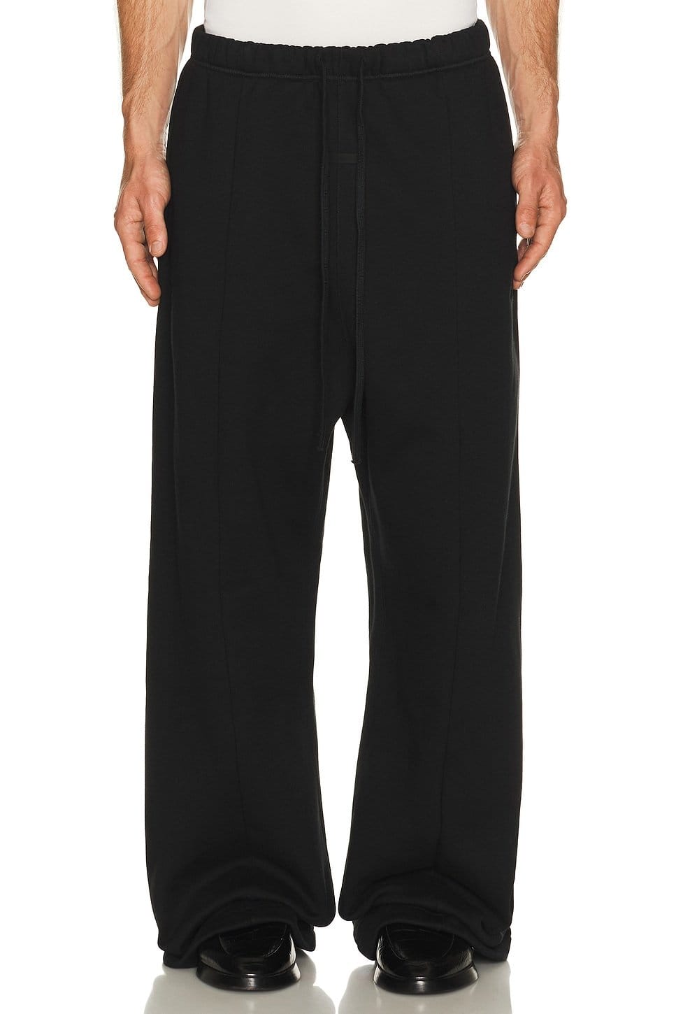 Luxurious black lounge sweatpants by Fear of God ESSENTIALS. Made from soft cotton blend, these pants offer a relaxed fit with a drawstring waistband and side pockets. Ideal for casual lounging or athleisure wear.