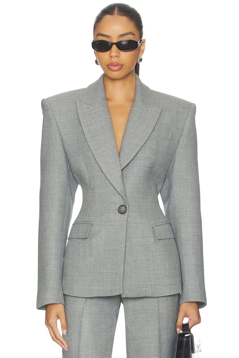 Sleek grey wool blazer by Alex Perry, featuring a single-breasted contour silhouette and structured lapels. Ideal for professional settings or smart-casual occasions.