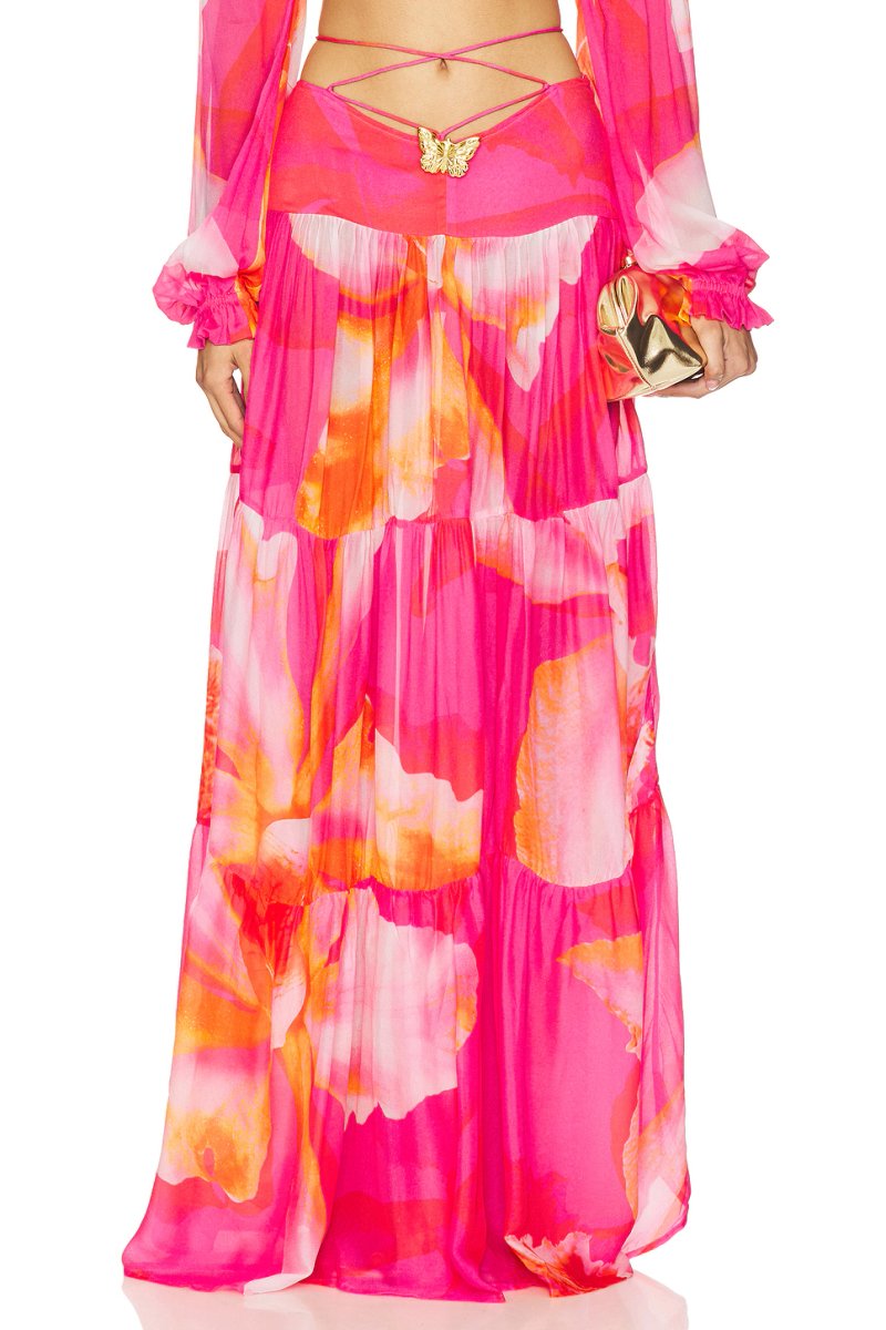 The Song Butterfly Skirt by Cin Cin features a vibrant floral print in Wildflower. This full-length skirt with tiered layers is perfect for a casual day out or an evening event.