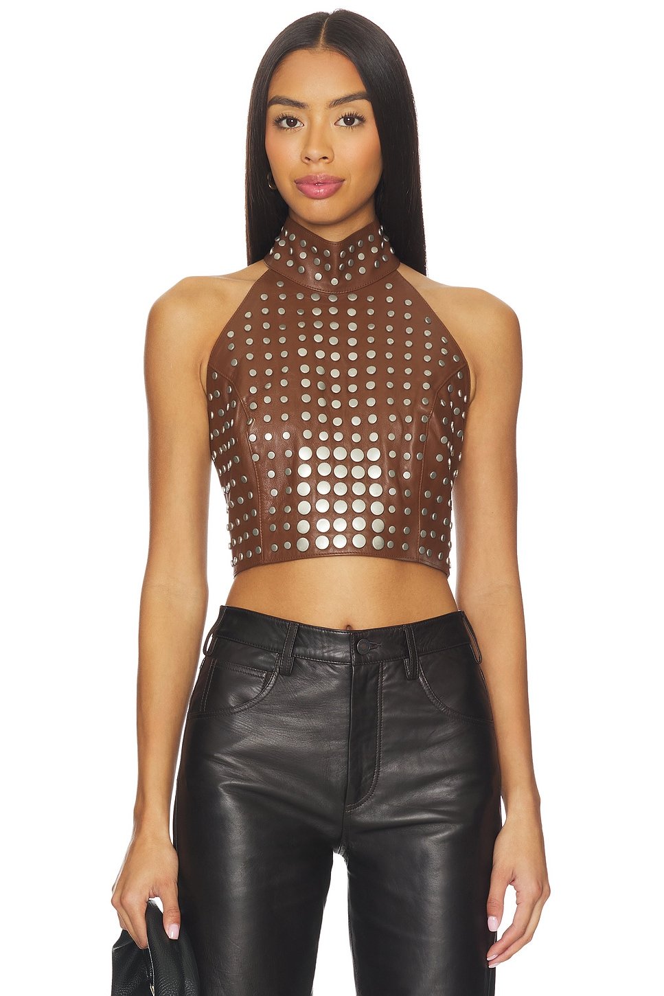 Crafted from brown leather, this cropped top features silver-studded detailing for a bold, edgy look. Perfect for those who love to make a statement with their fashion choices.