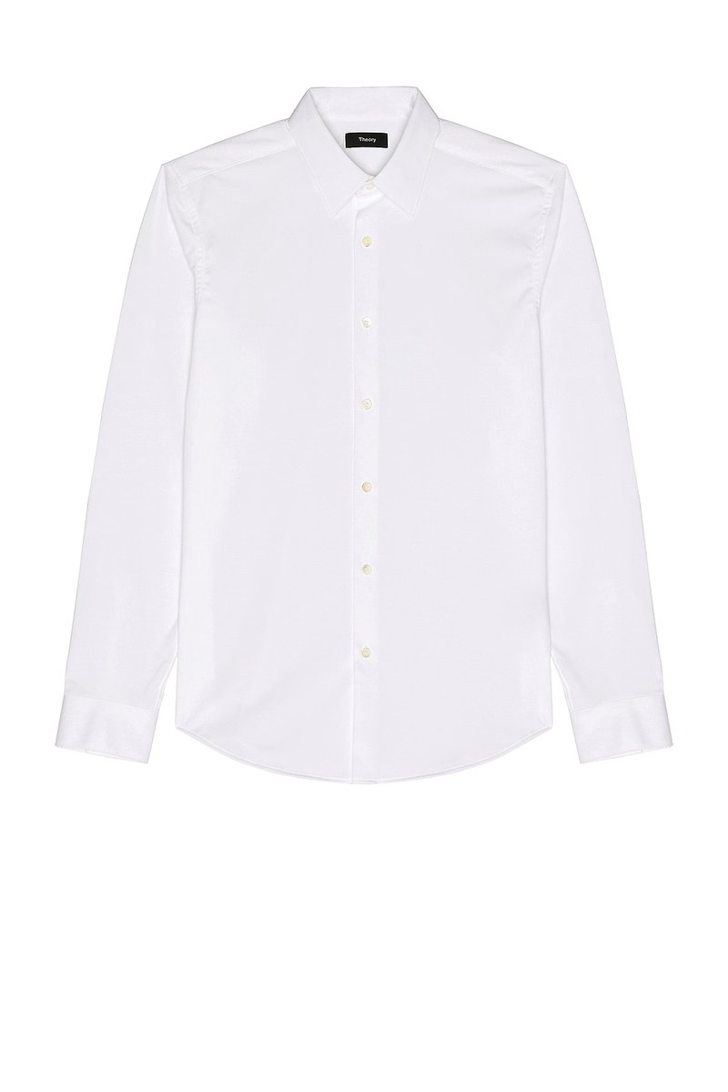 The Sylvain Structure Knit Shirt by Theory is crafted in a crisp, white fabric, offering a button-down collar and long sleeves for a refined look. Ideal for a slim fit, this shirt is perfect for both formal and casual settings.