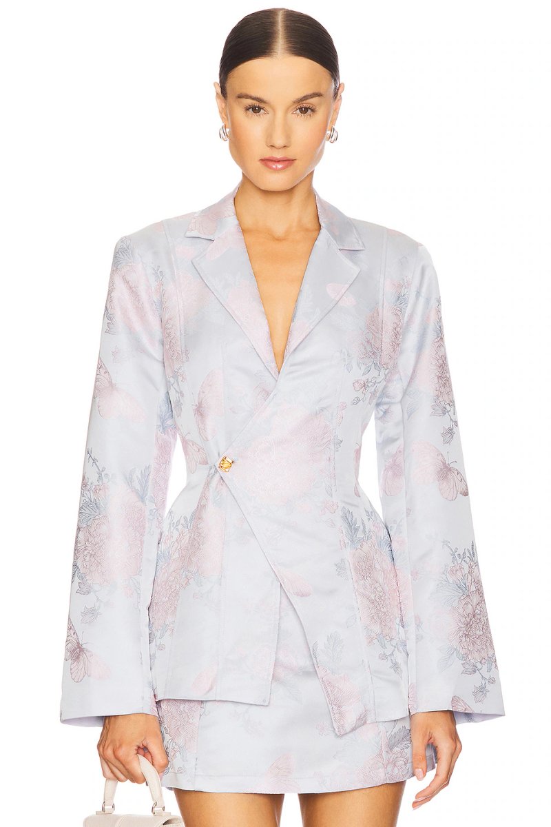 The Revolve Floral Asymmetrical Jacket in Azura is available in sizes XXXL, XXL, XL, XS, L, M, S.