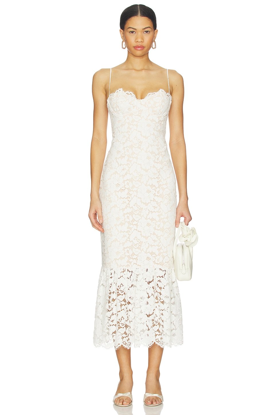 The Revolve Lovers and Friends Lace Midi Dress in White is ideal for evening, date-night, party.