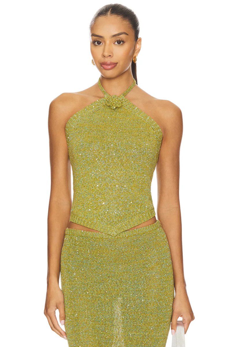 The Revolve Embellished Sequin Halter Neck Top in Olive Oil is ideal for evening, party, date-night.