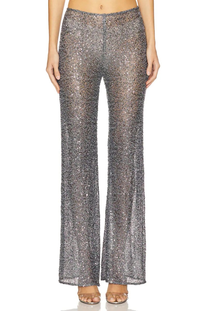 The Freya Pants by revolve features a gunmetal finish, wide-leg silhouette, and high-rise waist. Perfect for a modern and chic look, these pants are made from a sequin fabric for a glamorous touch.