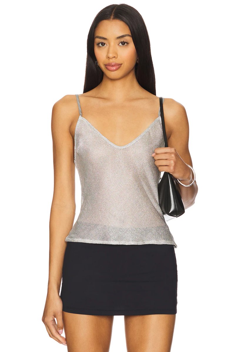 The Revolve Metallic V-Neck Cami Top in Silver is ideal for evening, casual, party.