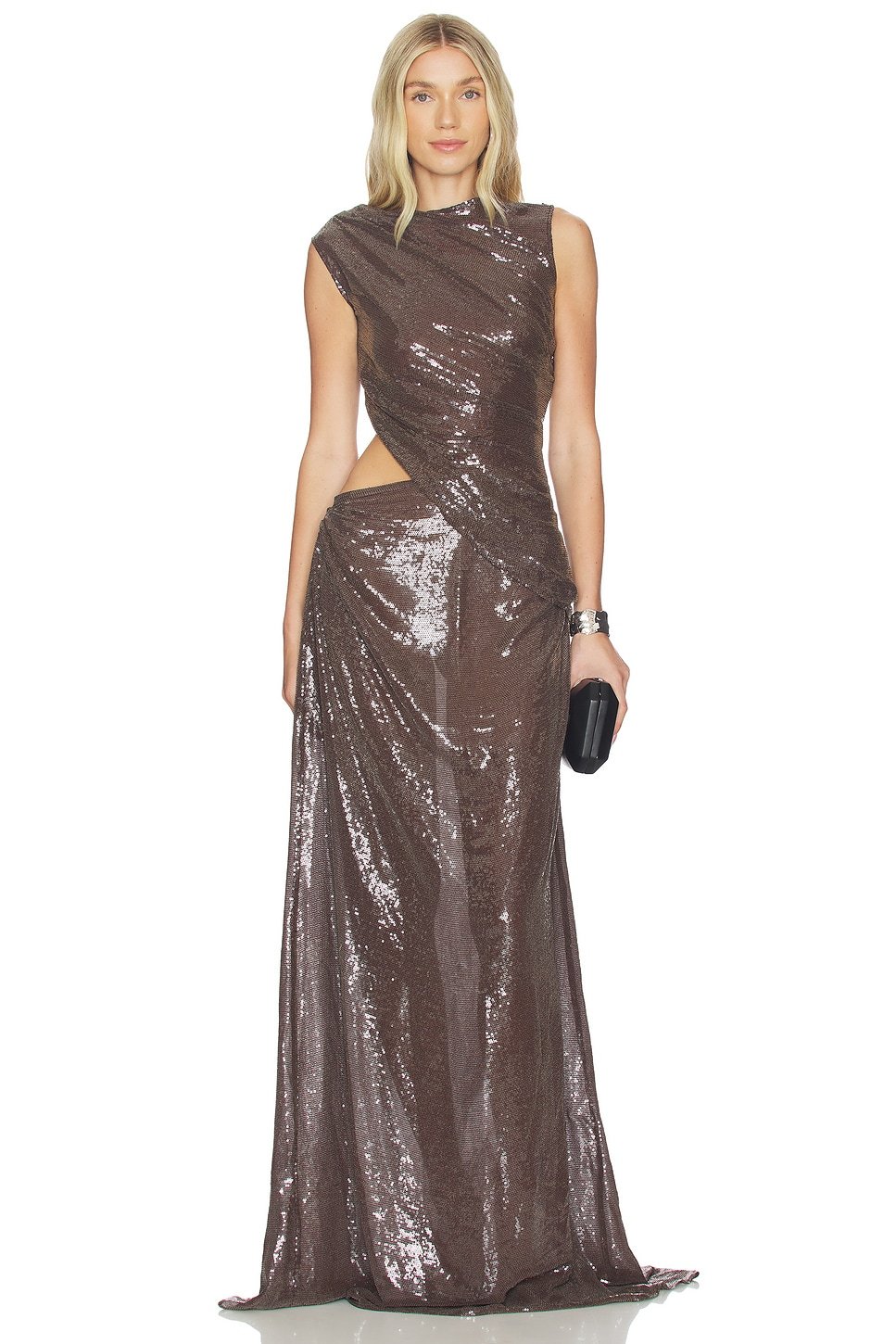 The Spencer Set by Deme by Gabriella features a slit and sequined details. Crafted from metallic fabric, this maxi dress is perfect for evening events.
