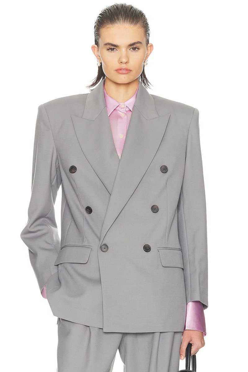 The St Germain Suit Jacket from Helsa features a carbon hue, double breasted design, and long sleeves crafted from high-quality fabric. Perfect for a modern and business-casual look