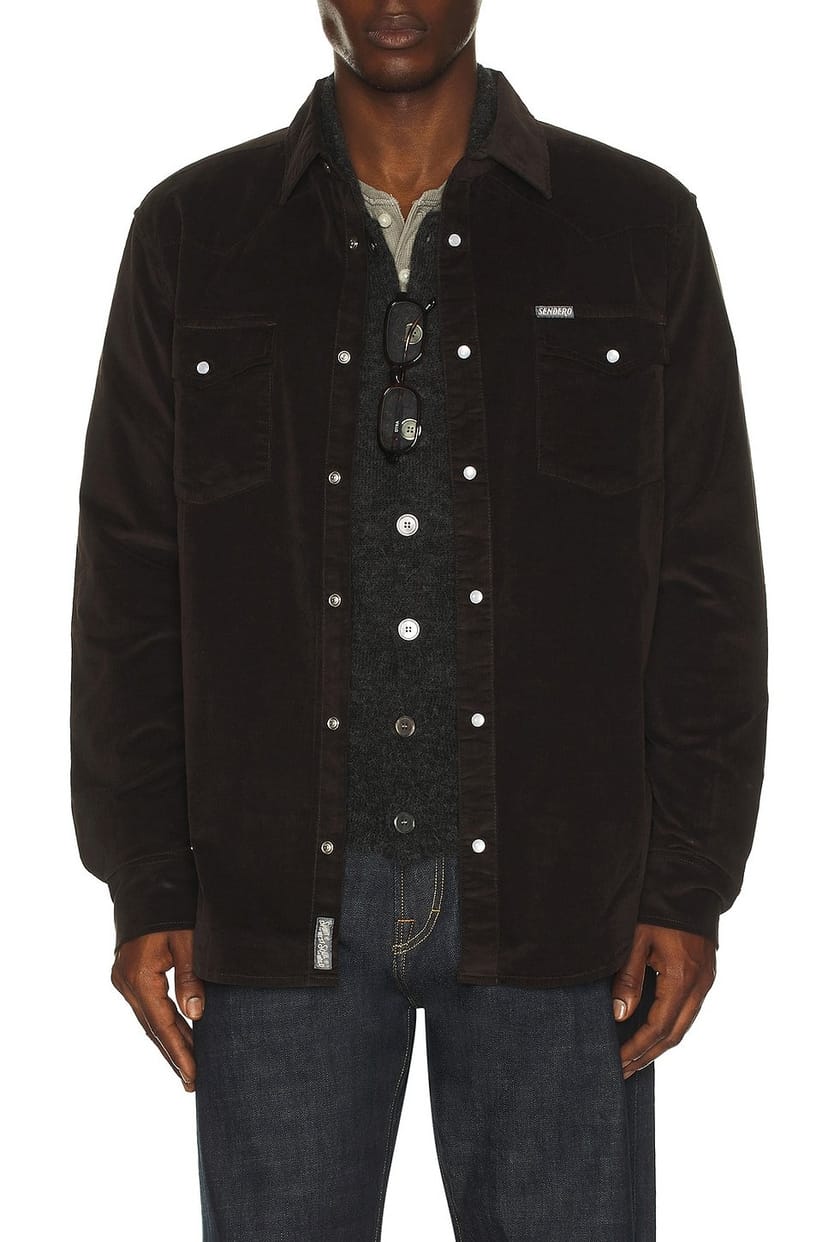 This charcoal pearl snap shirt from Revolve is crafted with a button-down collar and full button placket. Made from velvet fabric, it offers a snug fit and is perfect for casual occasions.