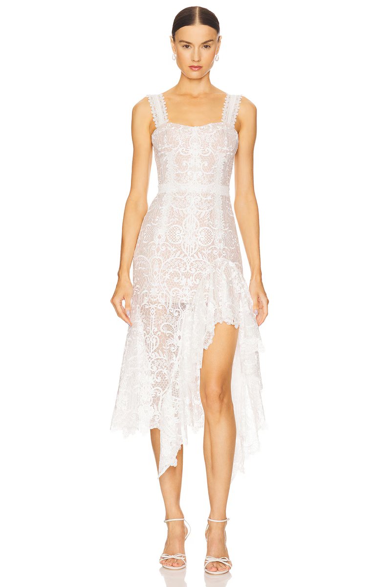 The Revolve Tiffany Blanc Lace Midi Dress in White is ideal for evening, formal.