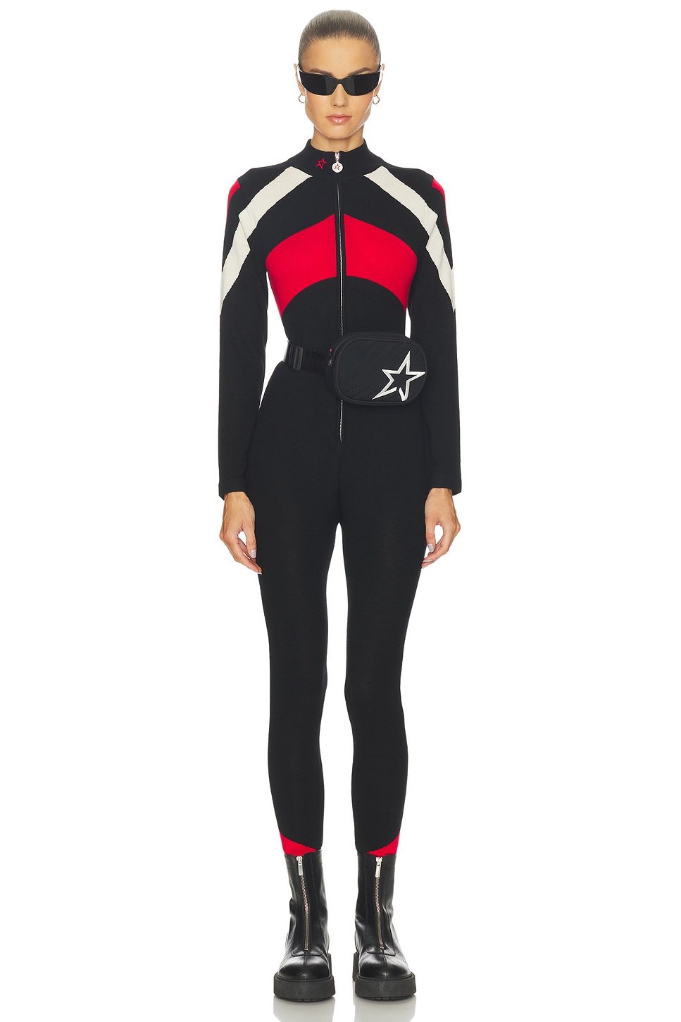 Designed with a zipper closure and long sleeves, this Tignes jumpsuit by Revolve in Black, White, and Red is perfect for a bold and trendy look. Crafted from a stretchy material, it features contrasting panels and decorative stars for a unique touch.