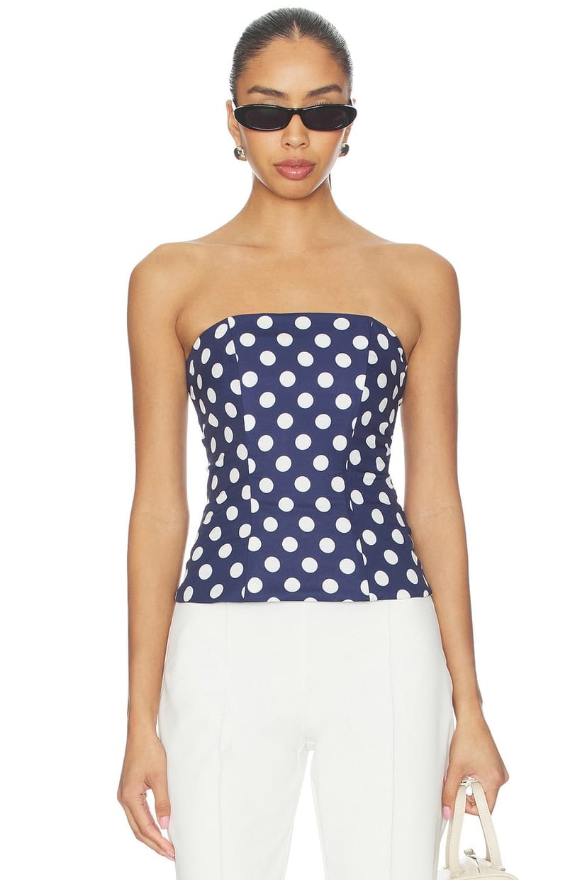 Stylish Navy & White Polka Dot Corset Top by Revolve. Features a bandeau neckline, polka dot pattern, and corset-style boning for a flattering fit. Perfect for casual outings or adding a pop of pattern to your wardrobe.