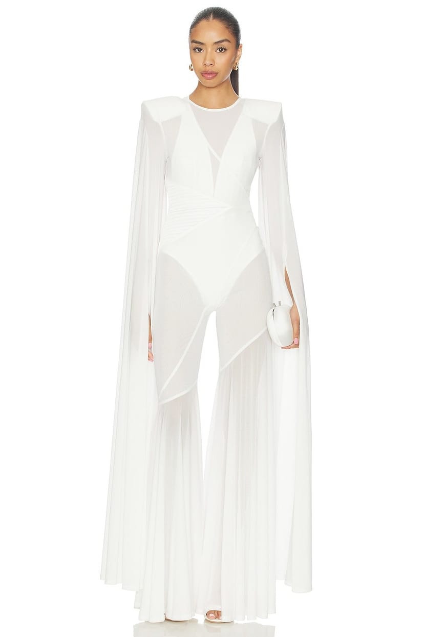 See all outfit ideasSleek white jumpsuit with a sheer bodice and wide-leg pants. Features long, flowing sleeves and a dramatic cape. Perfect for evening events or special occasions.