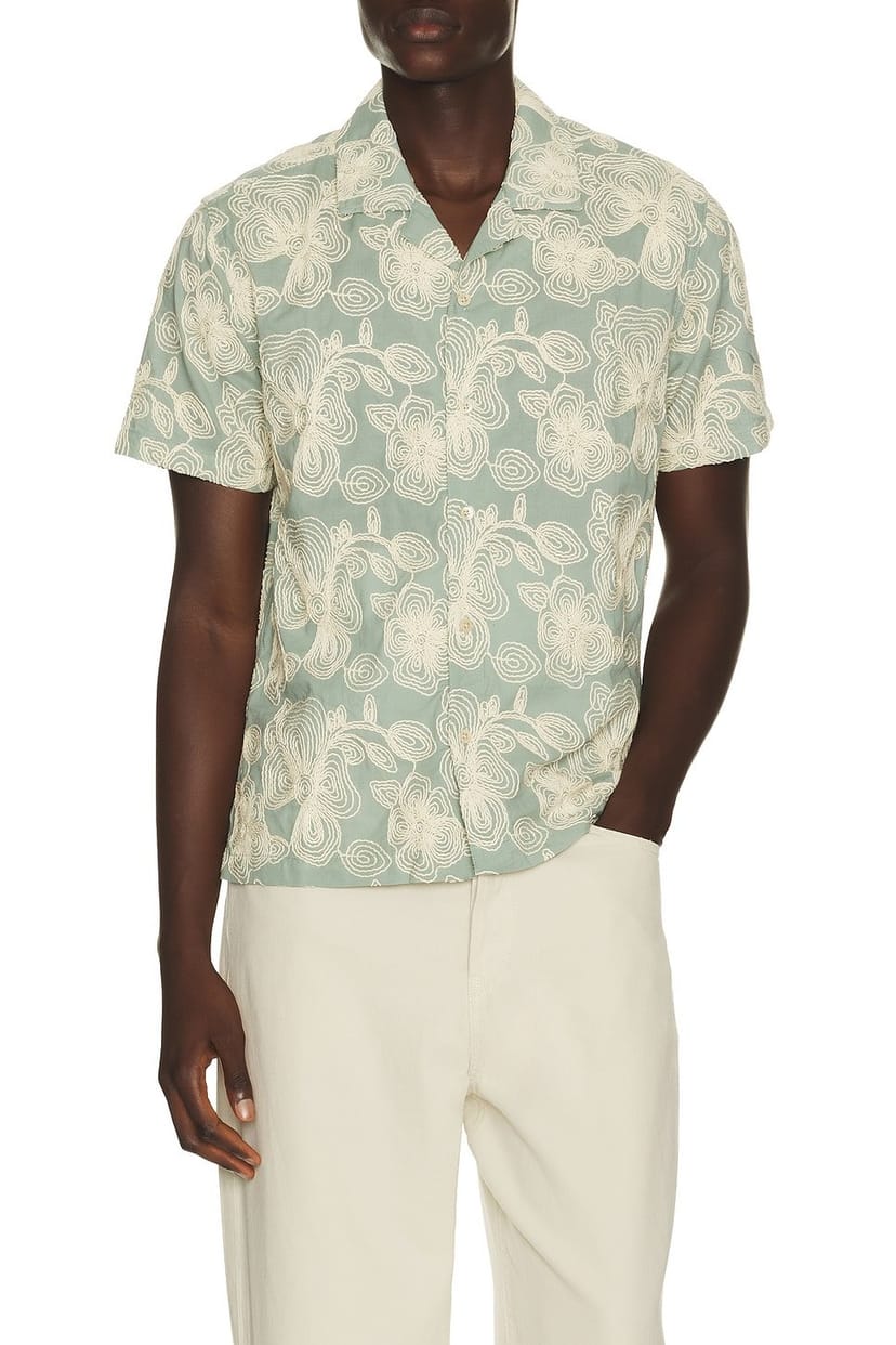 Stylish camp collared shirt in Floral Rope Jade featuring a floral embroidered pattern. Made from a lightweight fabric for a comfortable fit. Ideal for casual outings or smart-casual events.