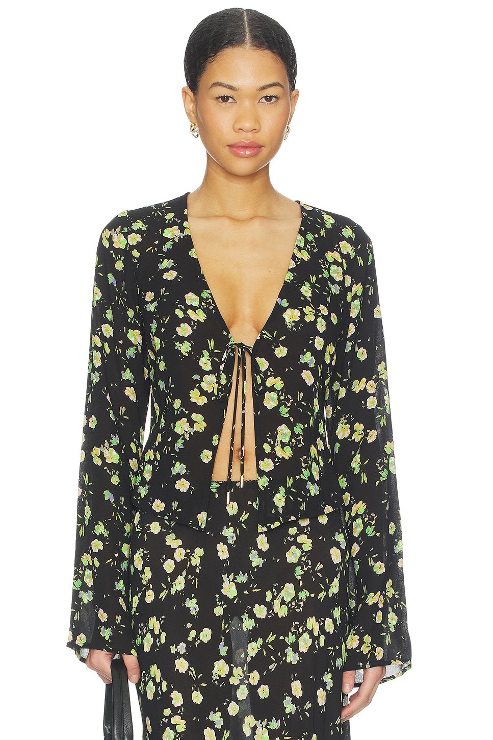 Elevate your wardrobe with this floral print top from Revolve, featuring a V-neckline and long sleeves. The lightweight fabric ensures comfort and style for any occasion.