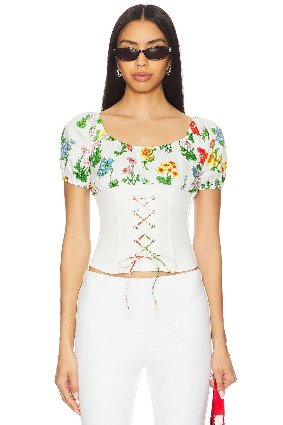 Playful crop top in white with a floral print and lace-up front. Features a corset-style design for a flattering silhouette. Ideal for casual outings or layering.