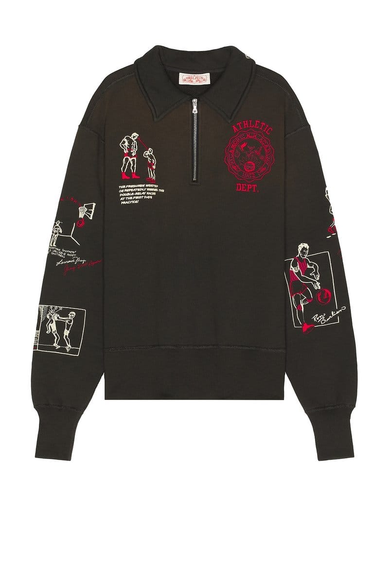 The Revolve Varsity 1/4 Zip Sweater with Graphic Design in Brown is available in sizes XXXL, XXL, XL, XS, L, M, S.