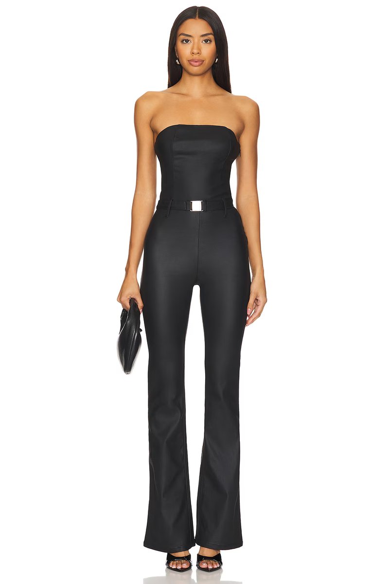 The Revolve Slim Flare Jumpsuit in Coated Black is ideal for evening, date-night.