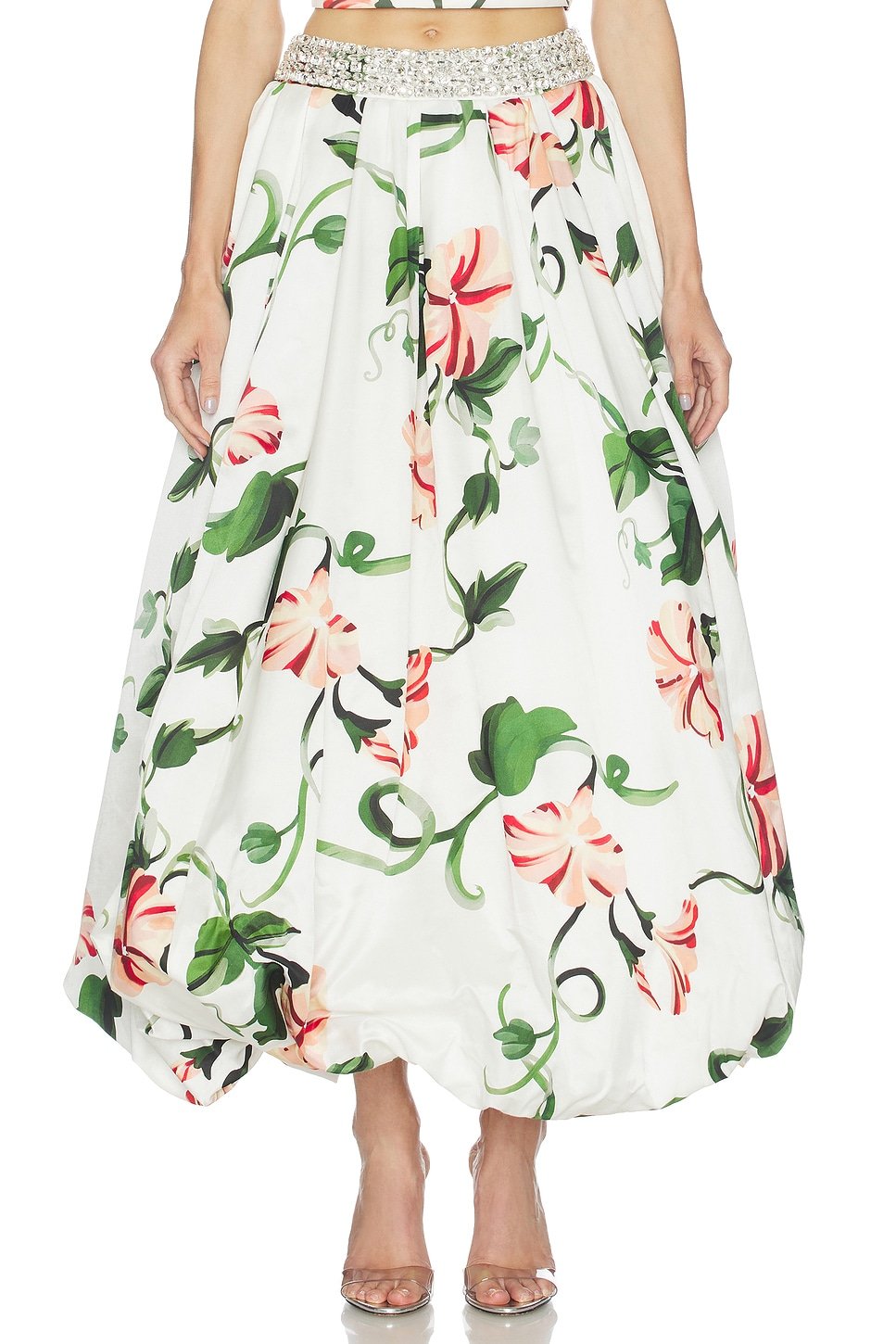 This floral puff maxi skirt is a stunning piece that features a maxi length silhouette. The vine print adds a touch of nature to the overall design.