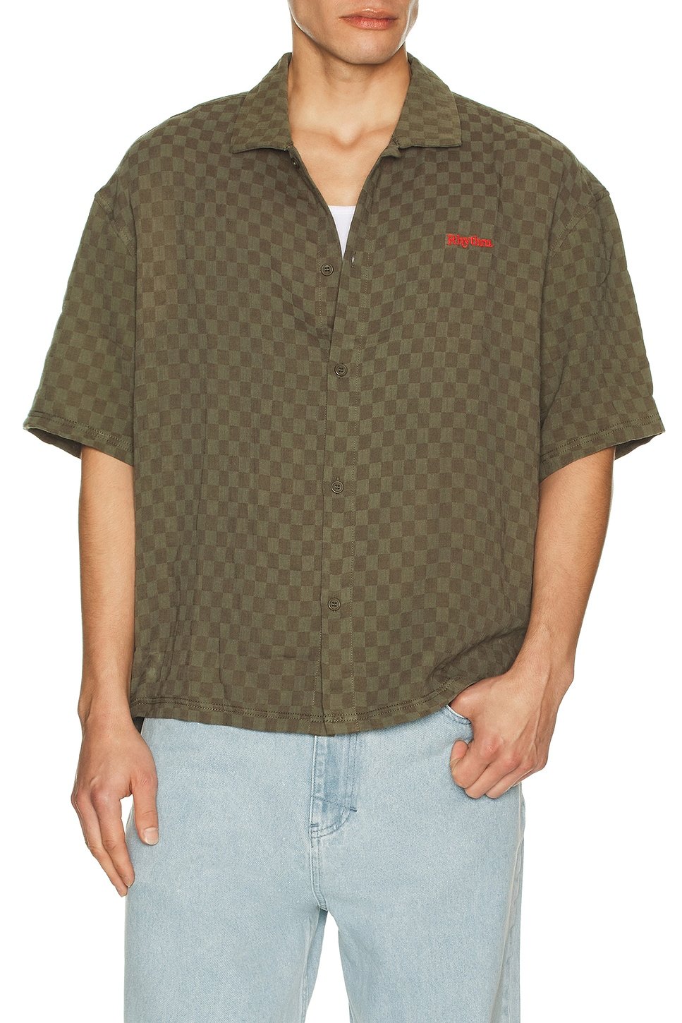 This Wash Check Relaxed Shirt from Revolve features a wash check pattern in green. The shirt has a button-up front, making it versatile for various occasions.