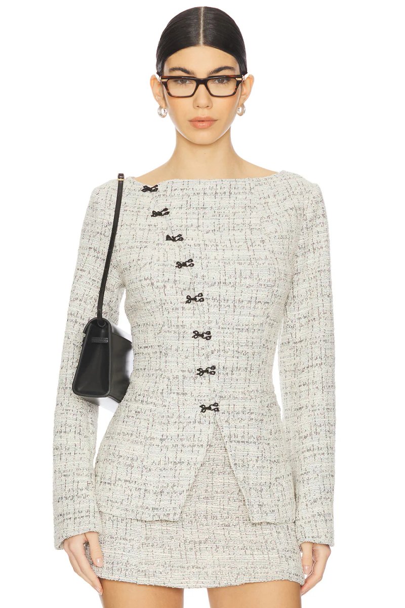 Crafted with a cream finish, this Wellington Jacket features a button closure and long sleeves, perfect for an elegant yet casual look.