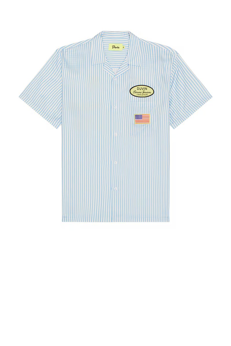 Blue Stripe Buttonup Shirt by Revolve — versatile button-up shirt with blue and white stripes, short sleeve, button front, relaxed fit, and cotton material. A casual and smart-casual choice for any occasion.