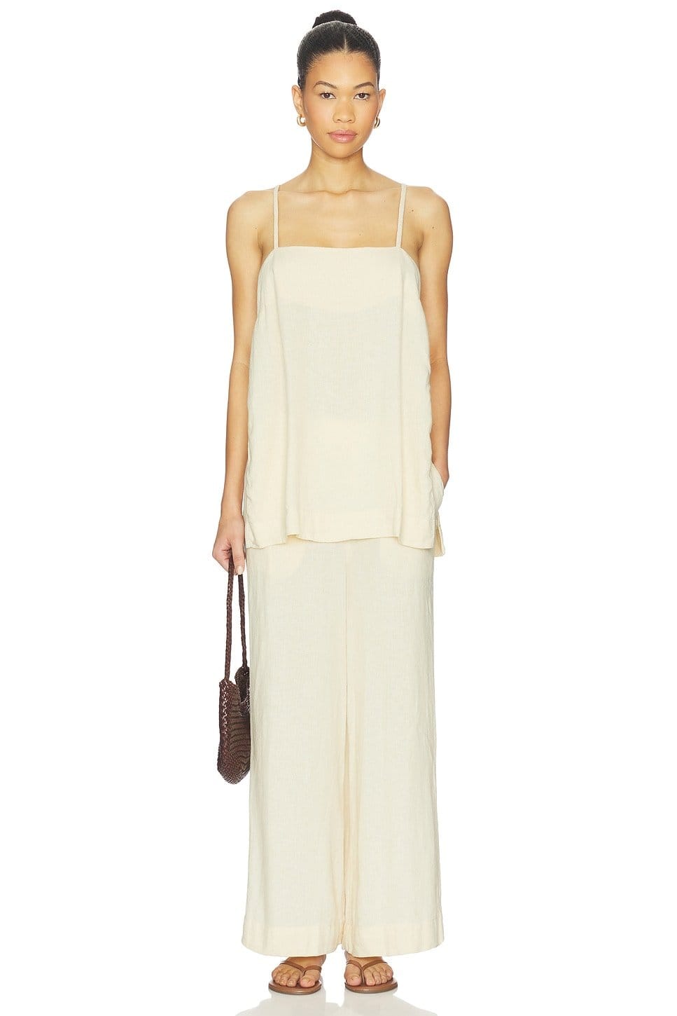 Elegant Tea Cookie jumpsuit set featuring wide-leg pants and a tank top. Perfect for a casual day out or a beach day.