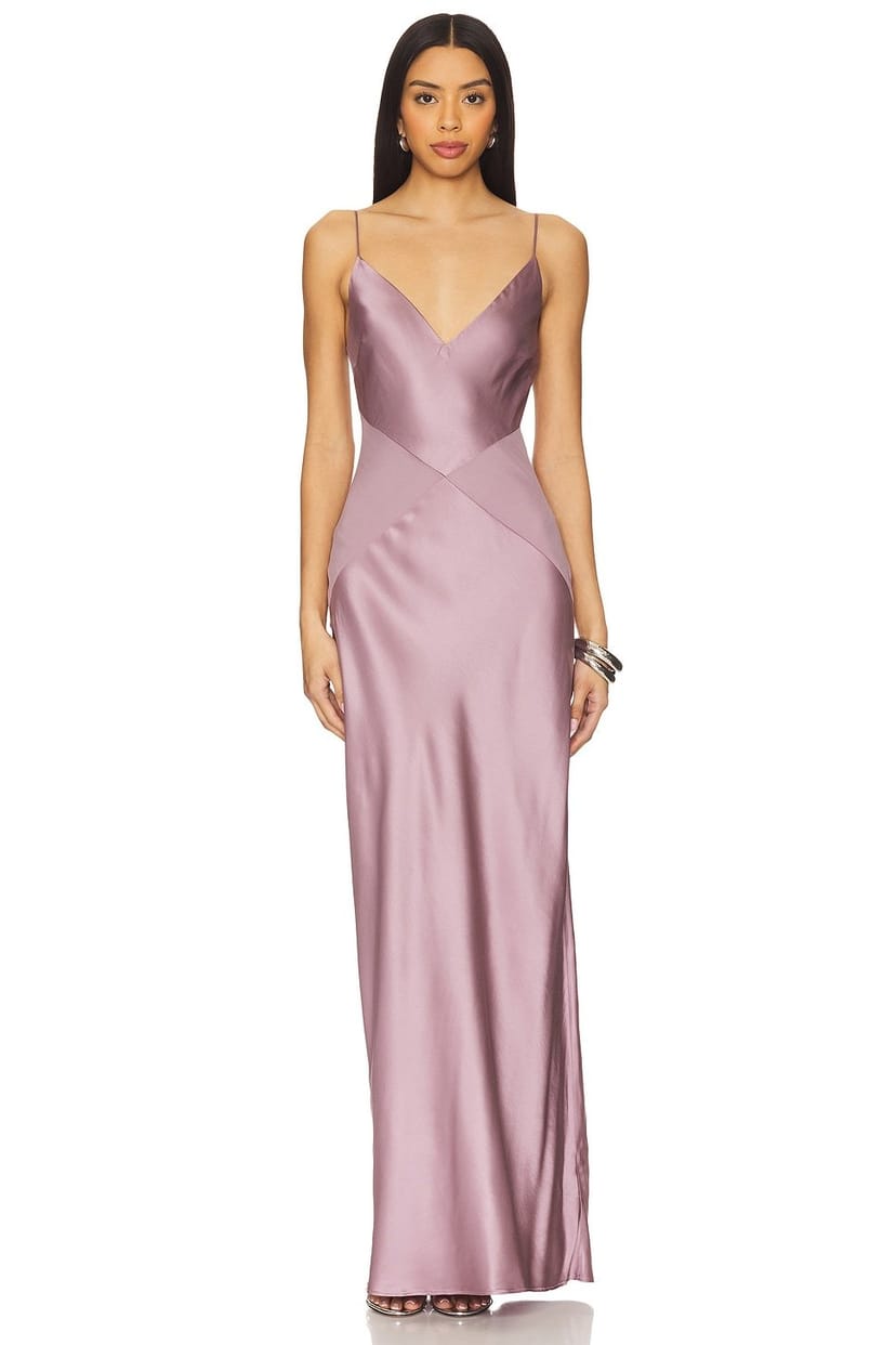 The Revolve Mauve Satin V-Neck Maxi Dress is made from satin.
