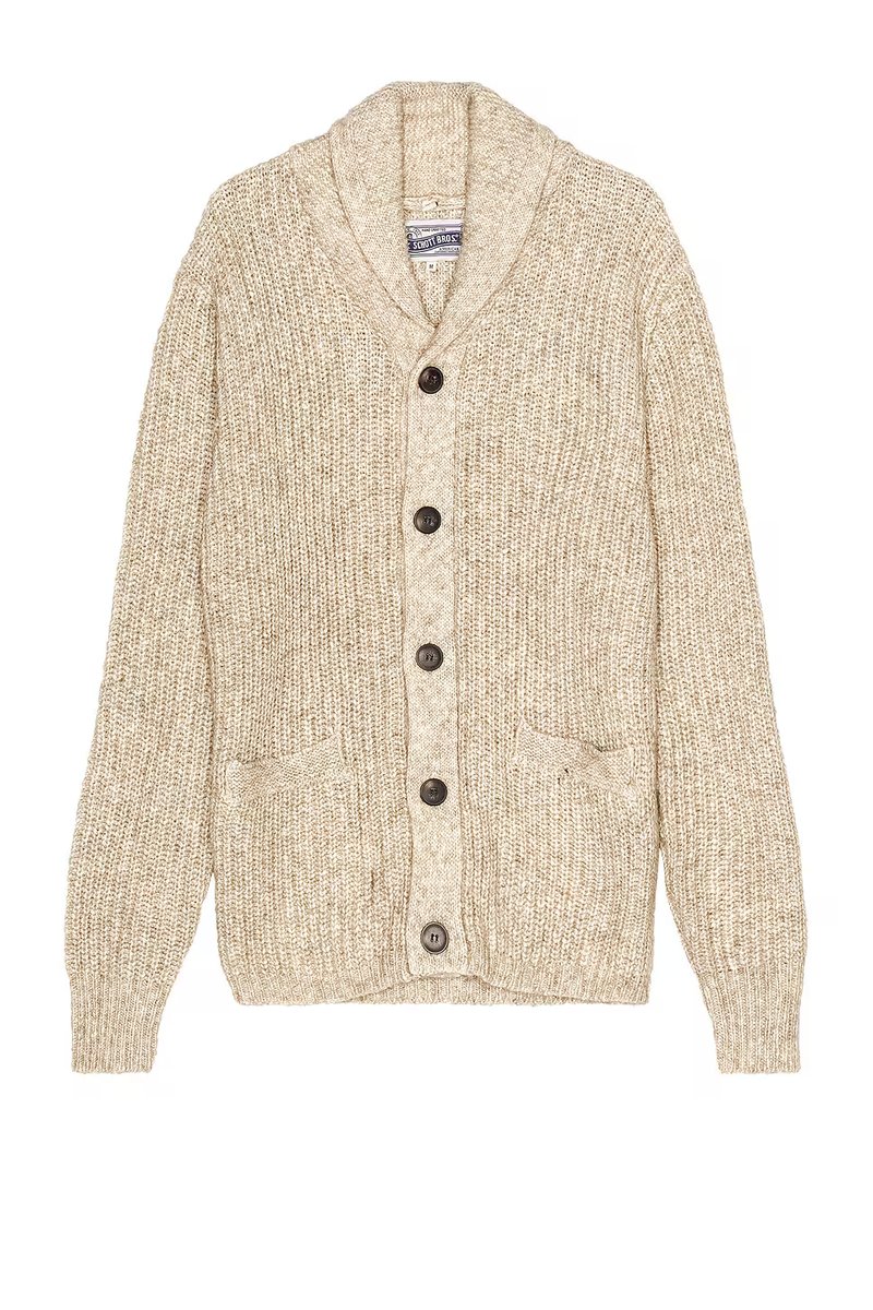 A warm and cozy cardigan by Schott, crafted from a yak blend. Ideal for layering in colder weather. Features a relaxed fit, crew neckline, and button closure. The neutral tone makes it versatile for casual or smart-casual looks.