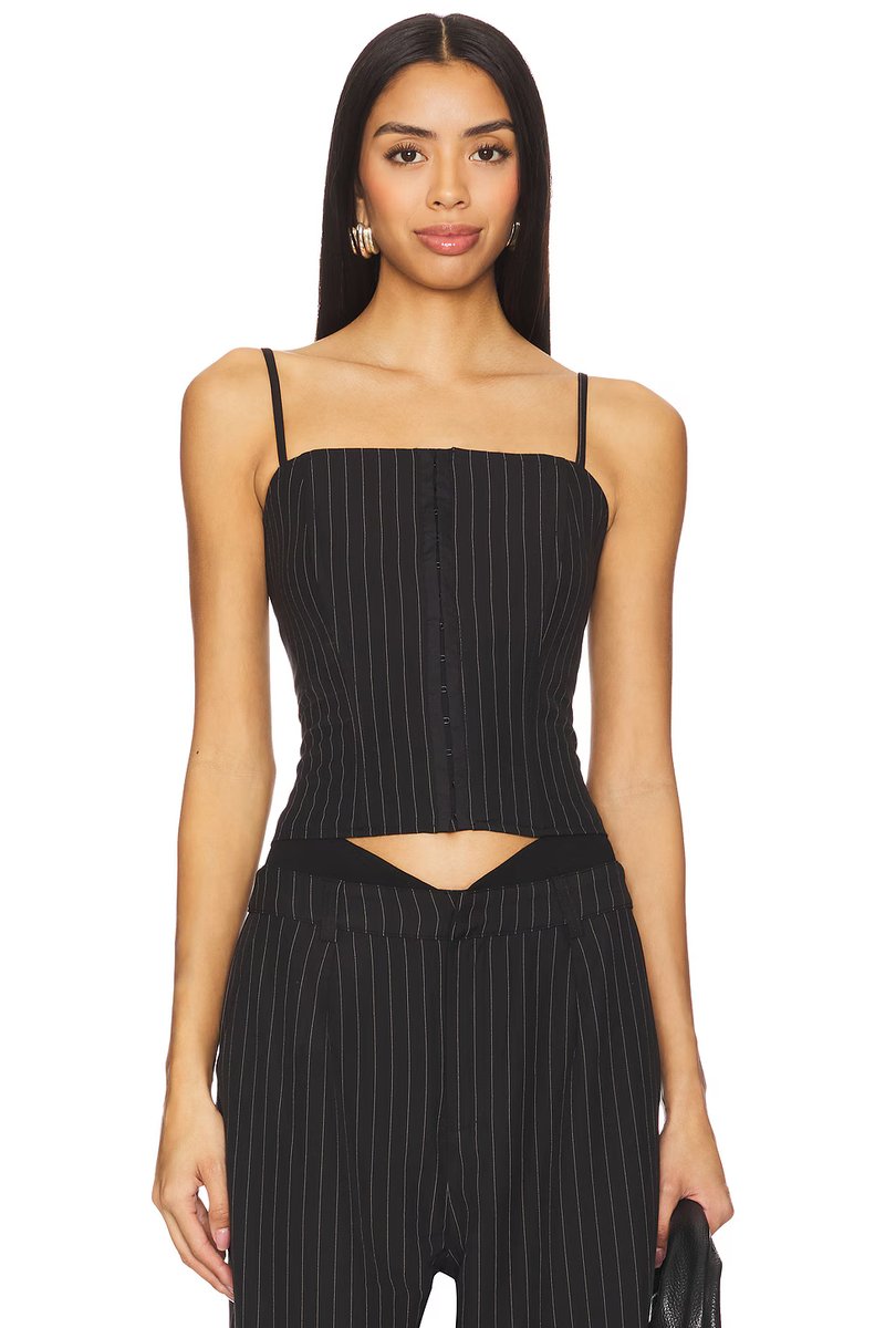 Designed with a cropped length, adjustable straps, and zipper closure, this corset top from revolve is perfect for adding a touch of drama to your outfit. The crisp black fabric and stripe detailing make it a versatile piece for various occasions.