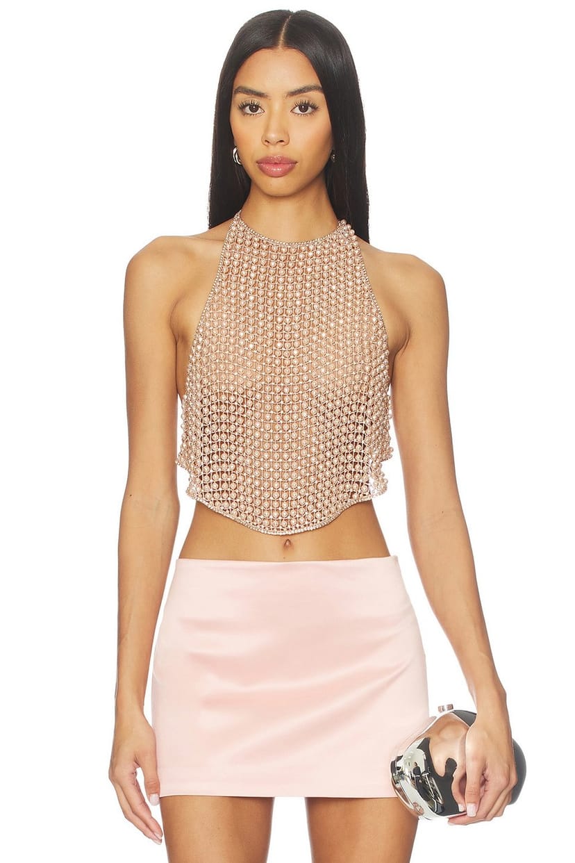 The Zoe Top from revolve features a rose gold embellished design, adding a touch of luxury and sparkle. Its halter neckline and sheer fabric provide a unique and stylish look.