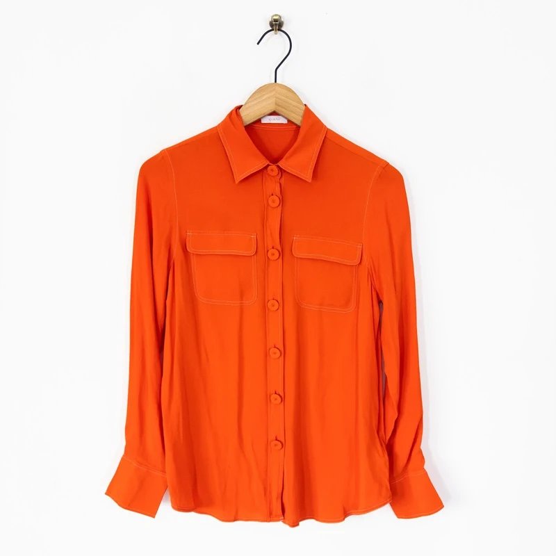 The Riani Button Up Silk Blend Shirt Blouse in Orange Red is available in sizes S.