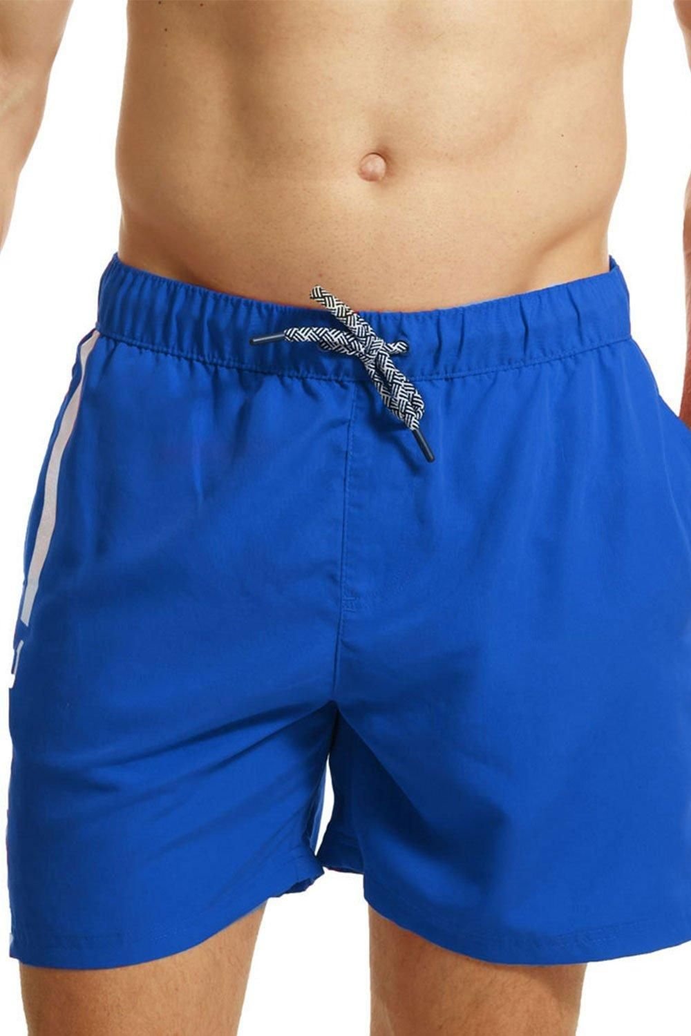 Stylish blue vertical stripe swim shorts by RIPT Essentials. Crafted from ultra-light, quick-drying fabric, these shorts offer maximum flexibility and comfort. Ideal for beach days and pool parties.
