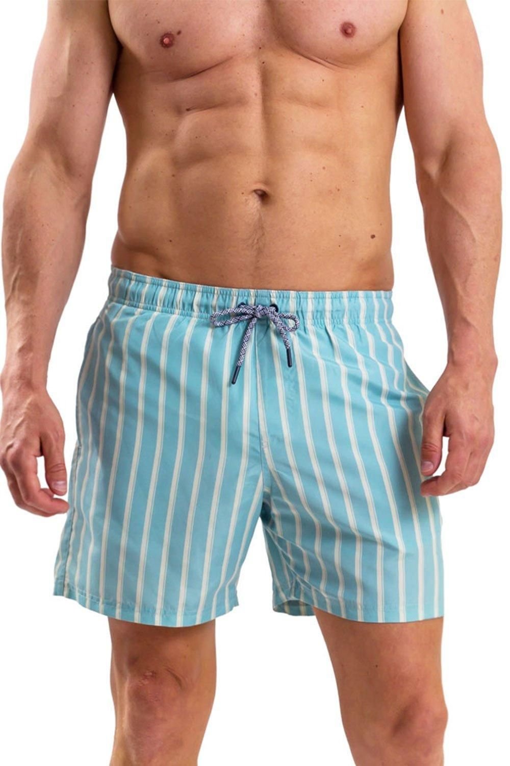 Lightweight swim shorts in light blue with a stripe print. Made from quick-drying fabric, these shorts offer maximum flexibility and comfort. Ideal for beach days and pool parties.