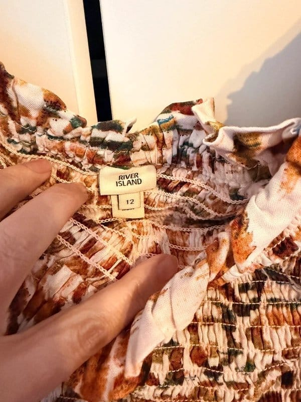 See all outfit ideasThis River Island maxi dress features a multi-coloured print in shades of brown, beige, and green. Made from a lightweight fabric, it has a gathered neckline and a smocked waist. The full skirt falls gracefully to the floor, perfect for a bohemian look.