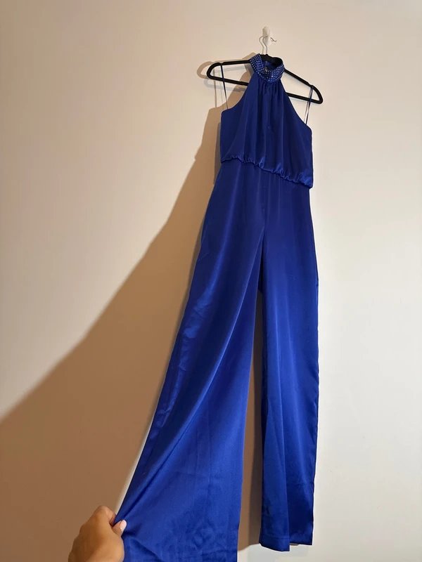 The River Island Blue Halter Neck Jumpsuit with Diamanté Collar is available in sizes M.