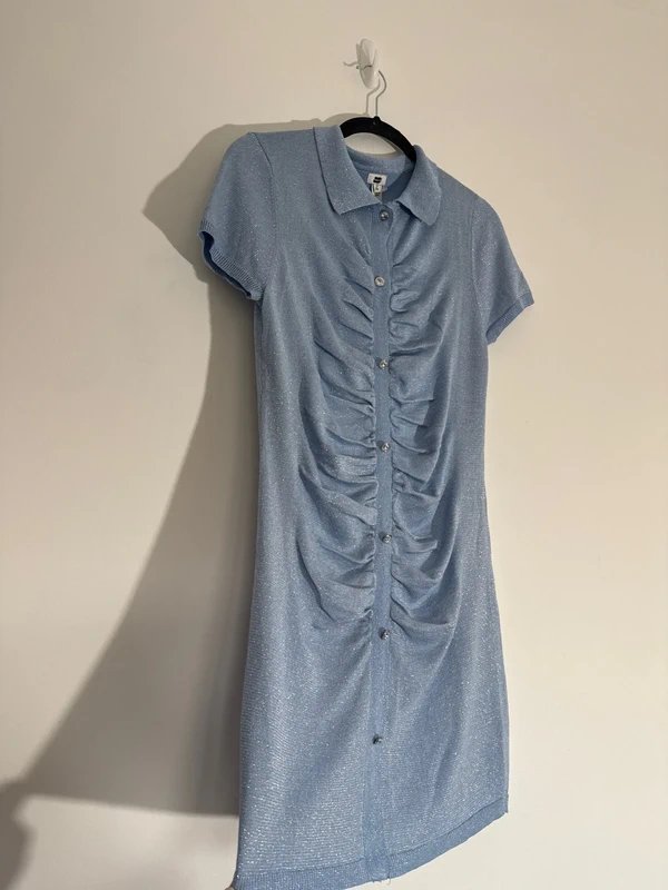 The River Island Blue Shimmer Knit Ruched Mini Dress is available in sizes M.