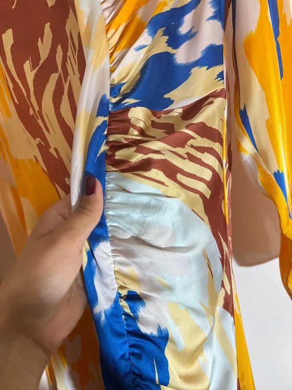 Elevate your wardrobe with this satin printed ruched side dress. Featuring a slit, it adds a touch of elegance to your look. Perfect for various occasions.