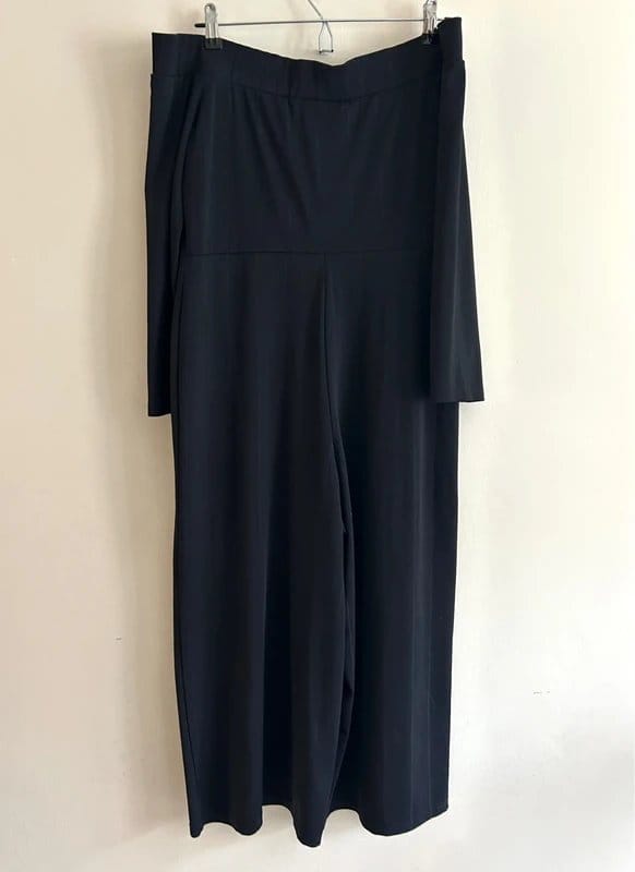 Effortlessly elegant black off-shoulder jumpsuit by River Island. Features a wide-leg silhouette with soft vertical ribbing that elongates the body. Ideal for parties, work dinners, or autumn occasions.