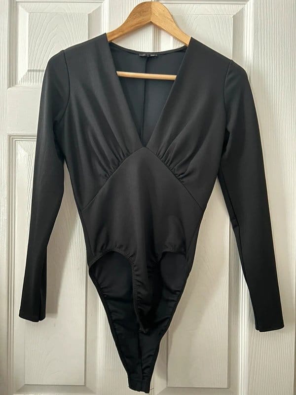 View Vinted's returns policySleek black bodysuit from River Island featuring a V-neckline, ruched detailing, and long sleeves. Made from stretchy fabric for a flattering fit.