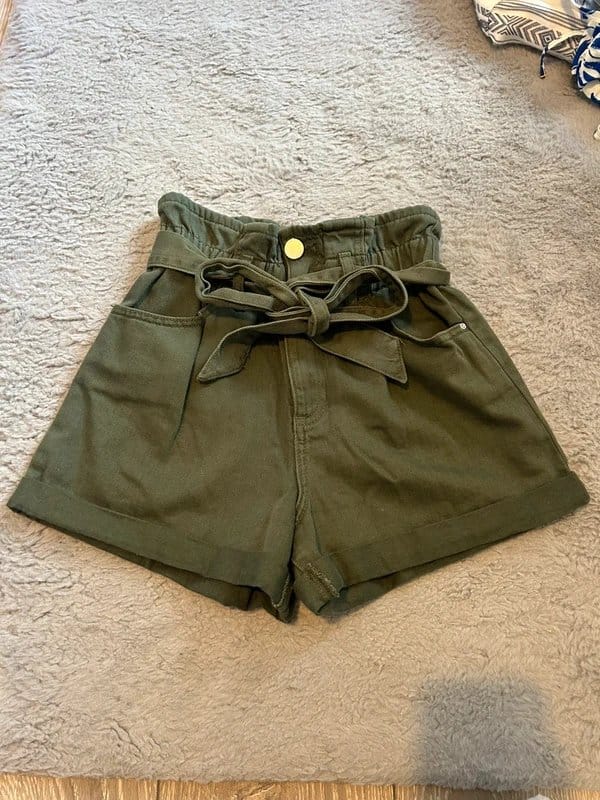 View Vinted's returns policyStylish dark green denim shorts from River Island. Featuring a high-waisted elasticated design with a tie belt for a flattering fit. Perfect for casual outings.