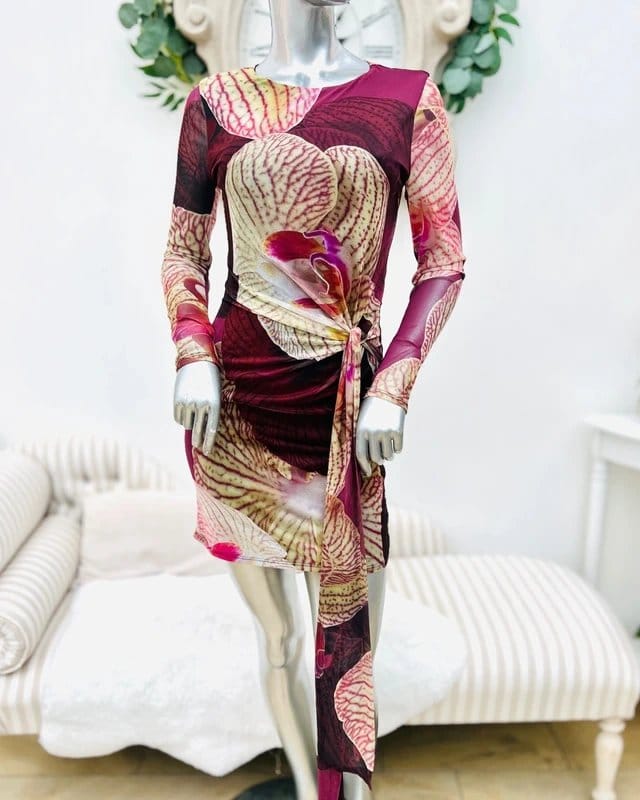 The River Island Burgundy Orchid Design Tie Waist Mini Dress is available in sizes S.