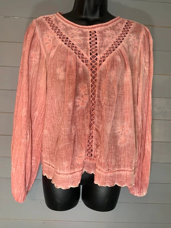 Beautiful peach pink boho-style blouse by River Island, made from 100% cotton — breathable, soft, and perfect for warmer days. Featuring a stunning crochet lace panel with scalloped edging and delicate embroidered detailing, giving it that dreamy whimsical / fairycore / bohemian aesthetic. A really easy, flattering piece to style — perfect with denim, skirts, or layered looks.